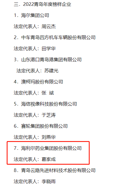 ? ? ? ?近日,由市委宣傳部指導,青島市企業聯合會、青島市企業家協會、青島日報社、青島市廣播電視臺、青島出版集團聯合主辦的2022青島年度經濟成就宣傳發布典禮舉行。市委副書記、市長趙豪志,市人大常委會主任王魯明等多位領導出席典禮,海利爾藥業集團股份有限公司獲評2022青島年度榜樣企業。