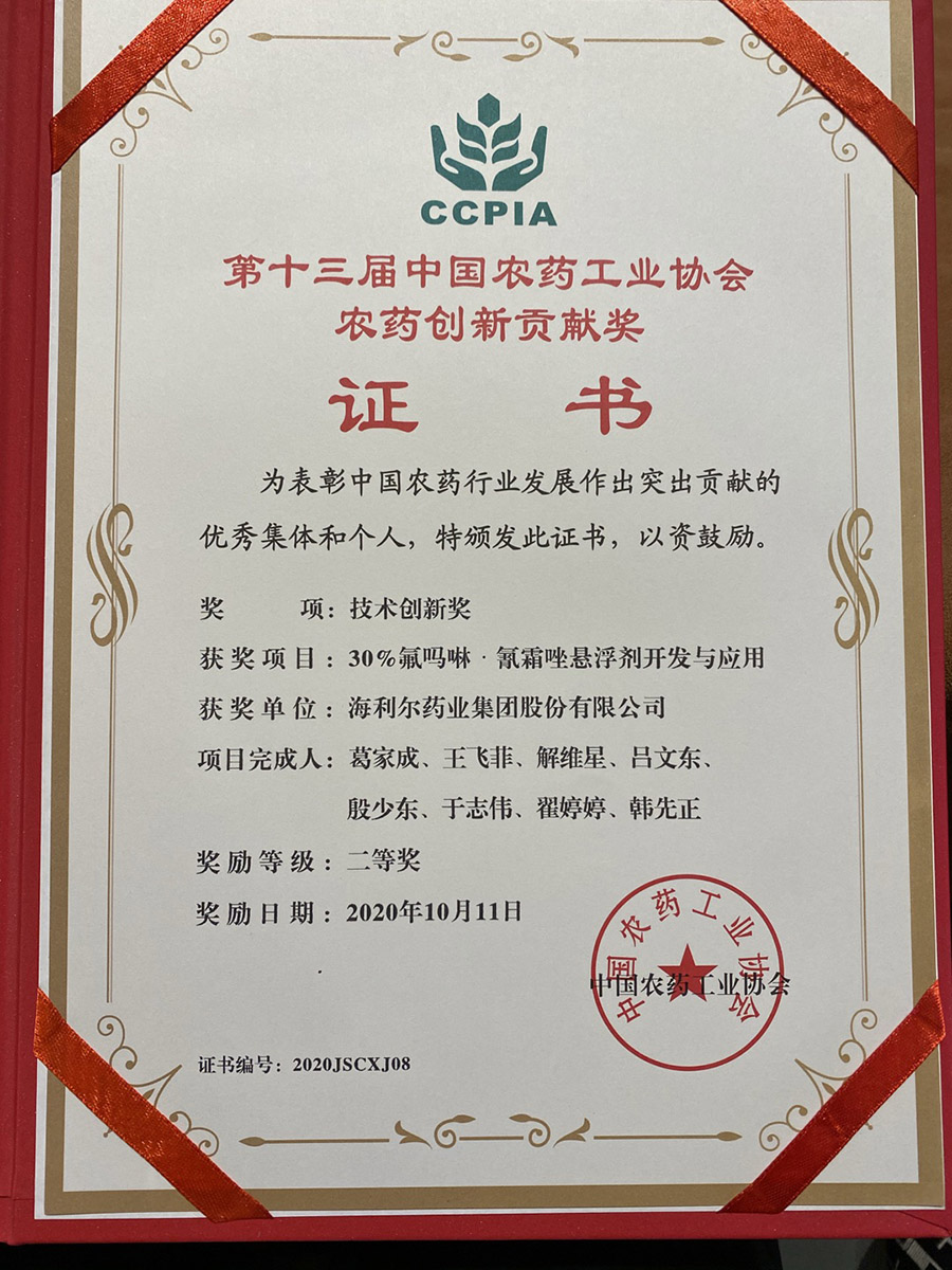 ????? ?10月11日,第十三屆中國農藥工業協會農藥創新貢獻獎名單揭曉,海利爾藥業集團股份有限公司榮獲技術創新獎二等獎。