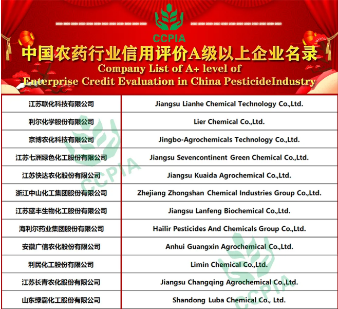 ? ?????10月11日,中國農藥工業協會在上海召開第二十屆全國農藥交流會,會議期間中國農藥工業協會向全社會隆重發布了2020年中國農藥行業企業信用評價等級的名單,海利爾藥業集團股份有限公司入選中國農藥行業信用評價A級以上企業名錄。