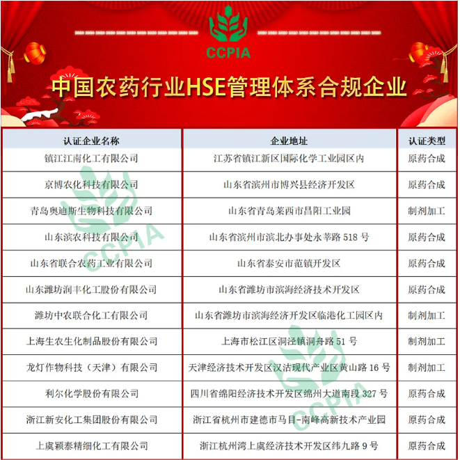 ???????10月11日,“中國農藥行業HSE管理體系合規企業”名單發布,海利爾藥業集團旗下子公司青島奧迪斯生物科技有限公司榜上有名。