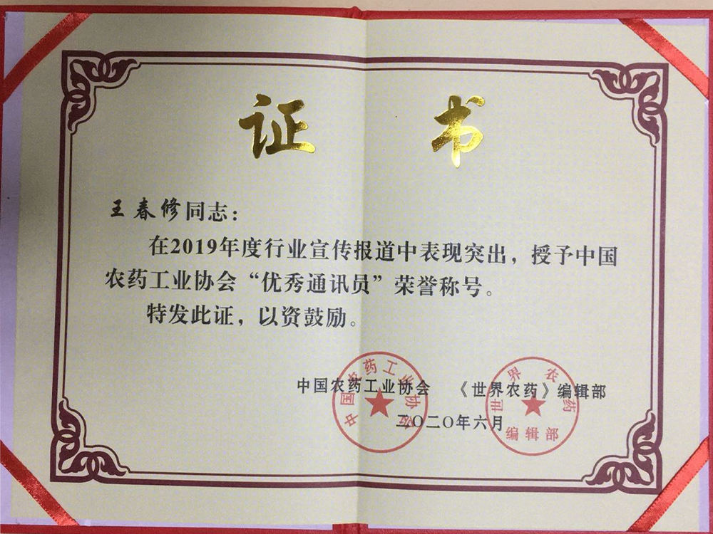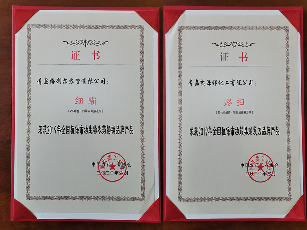 海利爾藥業集團榮獲“2020全國農藥行業銷售TOP100”第21名,細霸榮獲“2019年全國植保市場生物農藥暢銷品牌產品”,燼掃榮獲“2019年全國植保市場最具爆發力品牌產品”,研發中心制劑所王春修榮獲“優秀通訊員”稱號。