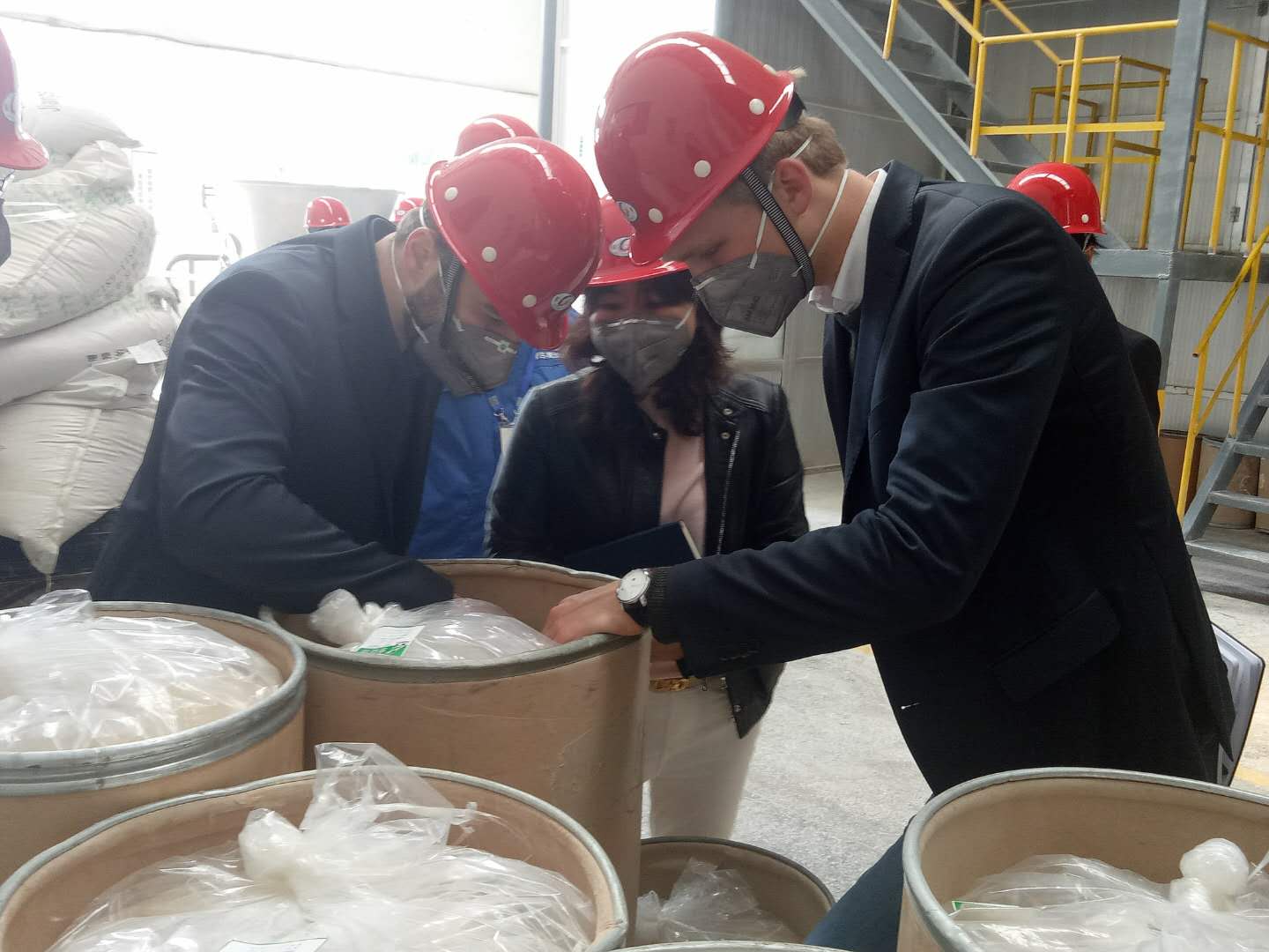 進(jìn)入生產(chǎn)廠區(qū)前,所有人員配戴口罩、安全帽,煙火上交,按照參觀流程參觀,并由各流程負(fù)責(zé)人現(xiàn)場(chǎng)介紹,在對(duì)工廠進(jìn)行了一圈參觀考察后德國(guó)漢姆公司領(lǐng)導(dǎo)對(duì)我們嚴(yán)謹(jǐn)?shù)墓ぷ鲬B(tài)度,規(guī)范化的流程表示了肯定。