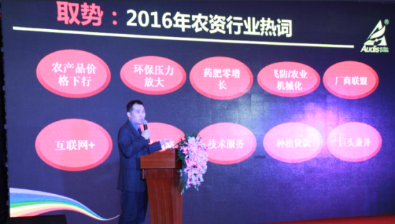? ? ? ?海利爾藥業集團國內制劑營銷中心市場總監陸元丁對農資行業的現狀進行了解讀并從取勢、明道、優術三個方面闡述了奧迪斯下一步的戰略規劃。他提到,奧迪斯具備清醒的自我認識,看清并把握了農資行業的發展趨勢,將憑借其在定位、產品、團隊方面的優勢抓住發展的機遇。他強調,奧迪斯有著清晰的戰略規劃,定位于做農藥殺菌劑的領航者,專注于高端殺菌劑,在2017年,奧迪斯將通過細化管理,打造大品,強化隊伍,提升服務四方面切實將戰略轉化為實際的行動和成果。他表示,奧迪斯愿與經銷商朋友通力合作,共同打造廠商利益共同體、命運共同體,區域作物綜合服務平臺。
