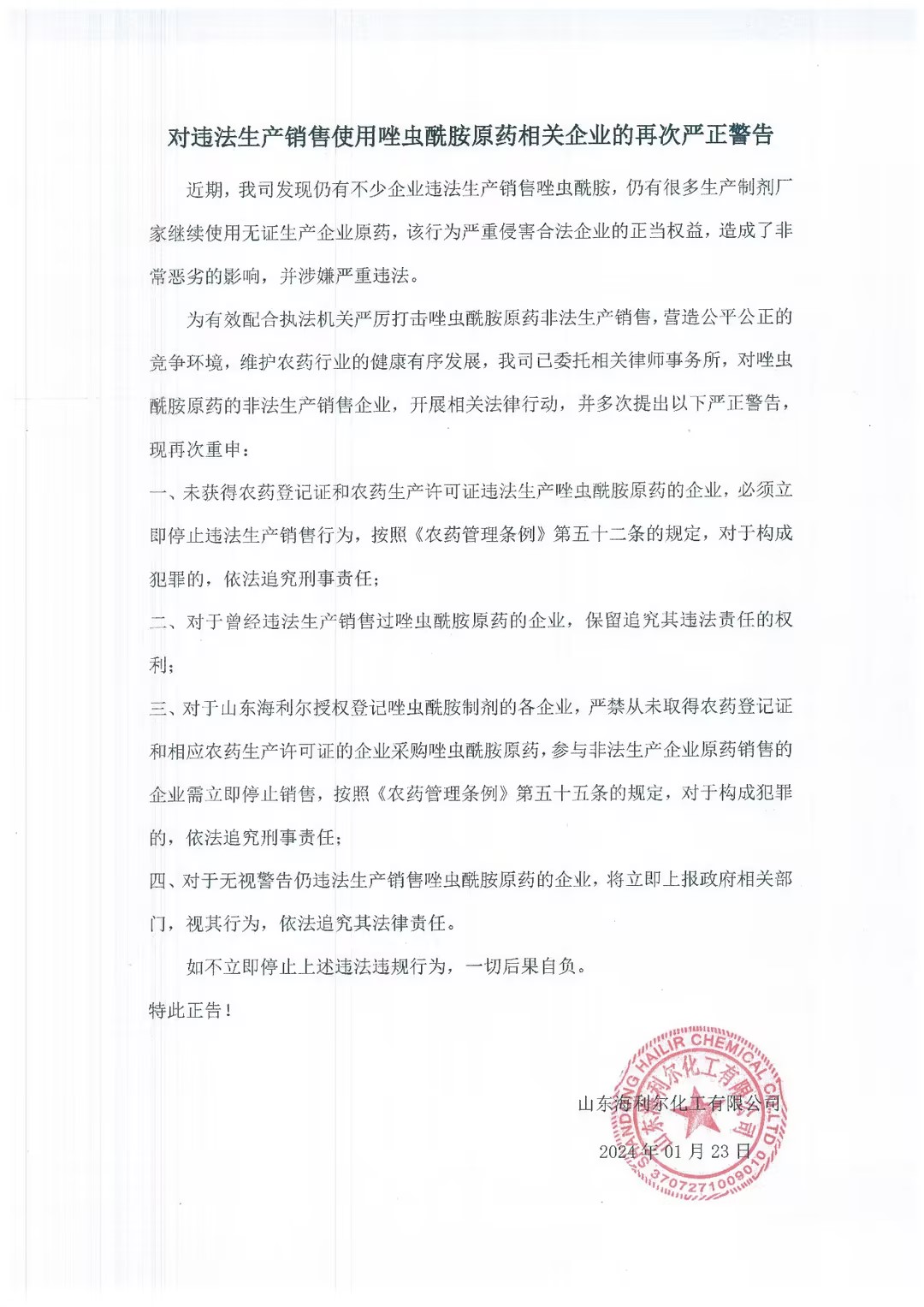 ? ? ? ?為有效配合執法機關嚴厲打擊唑蟲酰胺原藥非法生產銷售,營造公平公正的競爭環境,維護農藥行業的健康有序發展,我司已委托相關律師事務所,對唑蟲酰胺原藥的非法生產銷售企業,開展相關法律行動,并多次提出以下嚴正警告,現再次重申: